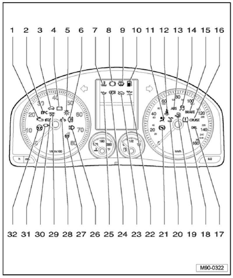 NOTE: Different instrument clusters are used, depending on vehicle equipment. Therefore, the arrangement of the control lamps may deviate from the illustration.