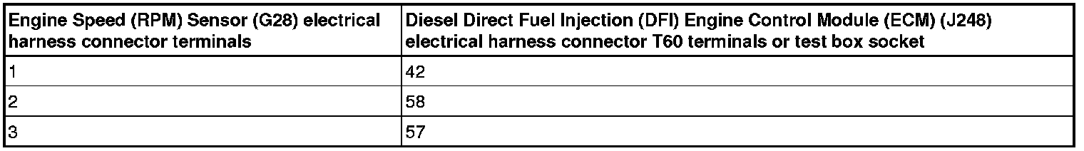 - Using a Multimeter, check the Engine Speed (RPM) Sensor (G28) electrical harness connector terminals to the Diesel Direct Fuel Injection (DFI) Engine Control Module (ECM) (J248) electrical harness connector T60 terminals for an open circuit.