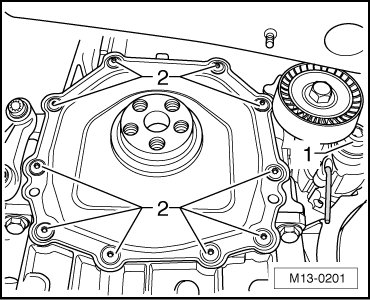 - Begin at the alignment bushings - arrows - and pry off the sealing flange - 1 - using a suitable screwdriver - A -.