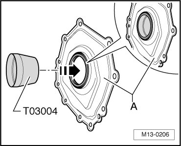 The oil seal guide sleeve (T03004) must stand out approximately 3 mm on the inner side - B -. The surface - A - is the outer side. The surface - B - is the inner side (sealing surface).