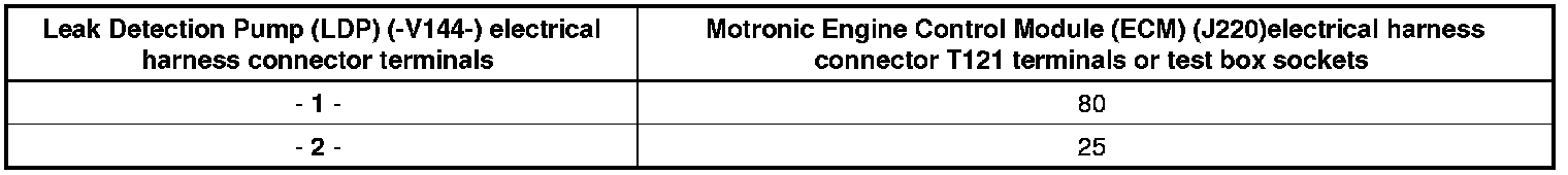 - Using a Multimeter, check the Leak Detection Pump (LDP) (-V144-) electrical connector to the Motronic Engine Control Module (ECM) (J220) electrical harness connector T121 for resistance.