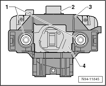 • The shear bolts - 1 - on the electronic steering column lock control module (J764) - 4 - must be drilled out in order to remove the steering column switch base - 3 -. New shear bolts will be needed later for installing.