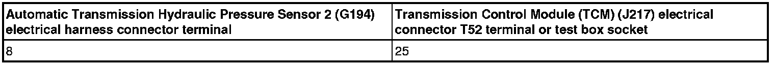 - Using a multimeter, check the Automatic Transmission Hydraulic Pressure Sensor electrical harness connector terminals to the Transmission Control Module (TCM) (J217) electrical harness connector T52 terminals for resistance.