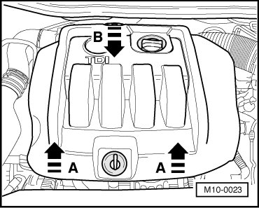 - First, pull engine cover at mounting points - arrows A - carefully out of retainer.