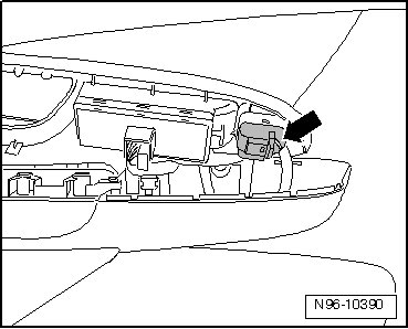 - Disengage retaining tabs - arrows - and remove Mirror Adjustment Switch - 1 - from grip panel.