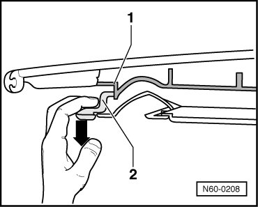 - Pull middle of trim - 2 - downward - arrow - out of the retainer - 1 -.