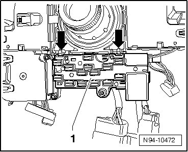 - Disengage catches - arrows - and pull off segment sensor for steering angle sensor - 1 - toward rear from steering column switch unit.