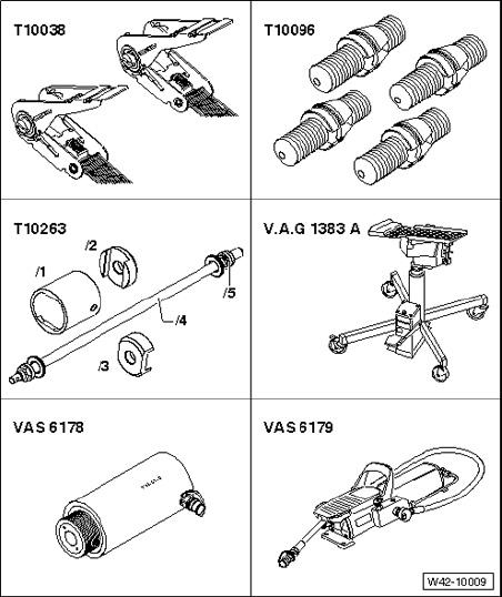 To locate subframe, Locating Pins T10096 must be screwed in one after the other on both sides of the vehicle at positions - 1 - and - 2 -.