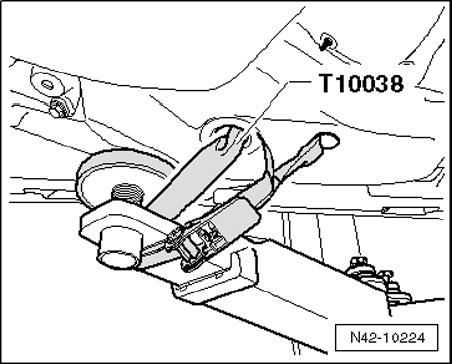 - Place Engine-/Gearbox Jack VAG1383A with universal transmission support V.A.G 1359/2 below subframe and secure using strap.