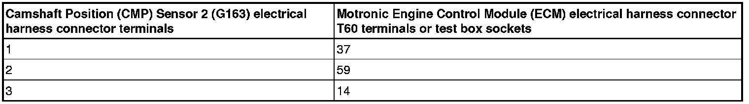 - Using a multimeter, Check the Camshaft Position (CMP) Sensor 1 (G40) - 14 -or Camshaft Position (CMP) Sensor 2 (G163) - 12 -electrical harness connector terminals 1 to 3 for voltage.