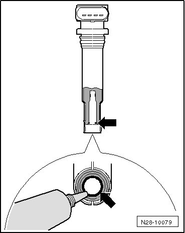 - Apply a thin bead of lubricating paste (G 052 141 A2) around the ignition coil sealing hose - arrow -. The bead must be 1 to 2 mm thick.