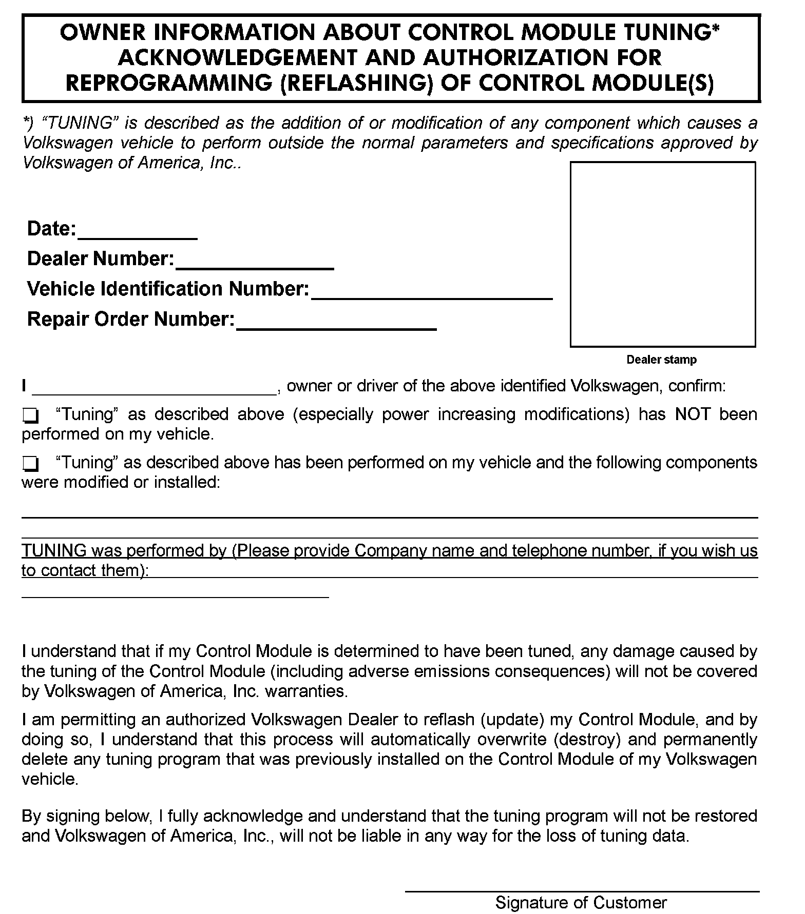 ^ Your dealership should place the vehicle owner on notice in writing, that their ECM was found to have been tuned, and that any damage caused by the tuning of the ECM (including any adverse emissions consequences) will not be covered by Volkswagen of America, Inc. warranties.