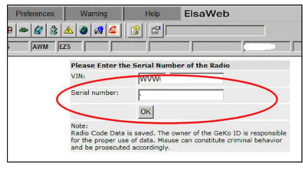 The radio anti-theft code can only be retrieved through the VAS diagnostic tester or through ElsaWeb. An active online connection and valid GeKo ID are required.