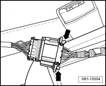 - Disengage harness connector at points designated with - arrows - and disconnect it.