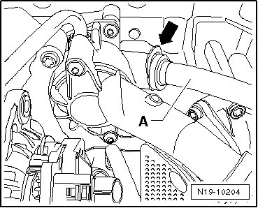 - Pull out the retaining clip - arrow - and remove the coolant pipe - A -.