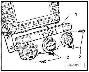 - Remove the bolts - 2 - (1.5 ± 0.2 Nm) and the A/C control head (E87) - 1 - from the instrument panel.