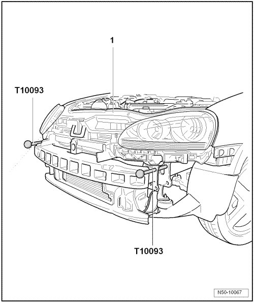 - With a second technician, remove guide rod (T 10093) on longitudinal member on left and right sides and lift out lock carrier.