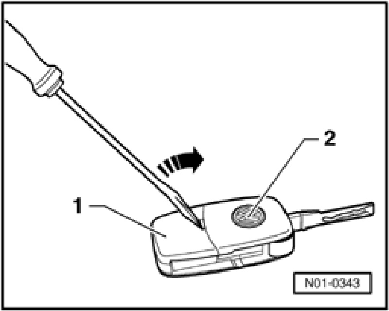 - Insert a screwdriver in the slot between the transmitter unit -1- and the main key -2-.