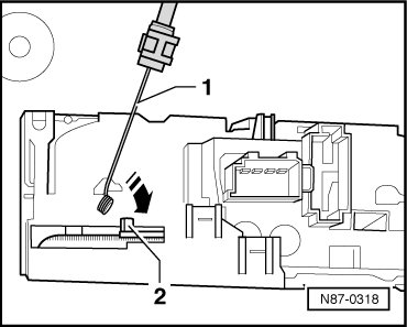 - Press cable for footwell/defrost, cable for temperature door and cable for central door - 1 - into retainer - 2 - until it engages.