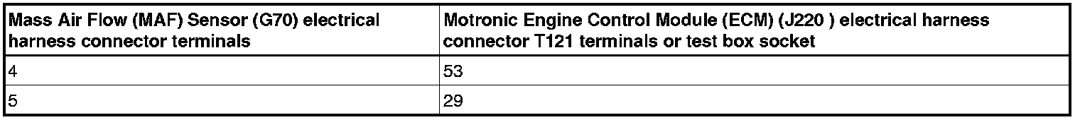 - Using a multimeter, check the Mass Air Flow (MAF) Sensor (G70) electrical harness connector terminals to the Motronic Engine Control Module (ECM) (J220) electrical harness connector T121 terminals for resistance.