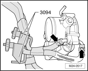 - Clamp off the coolant hoses using (3094) and disconnect them from the throttle valve connections - arrows -.