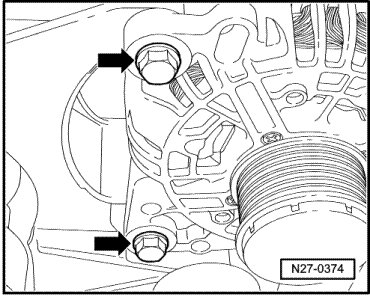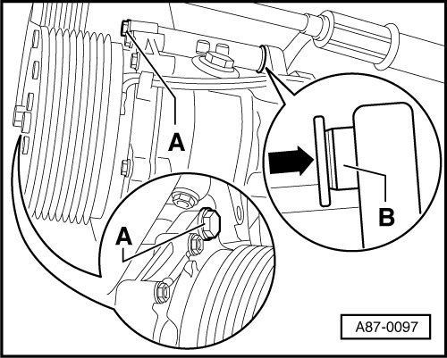 - Remove the bolts - A - on the A/C compressor.