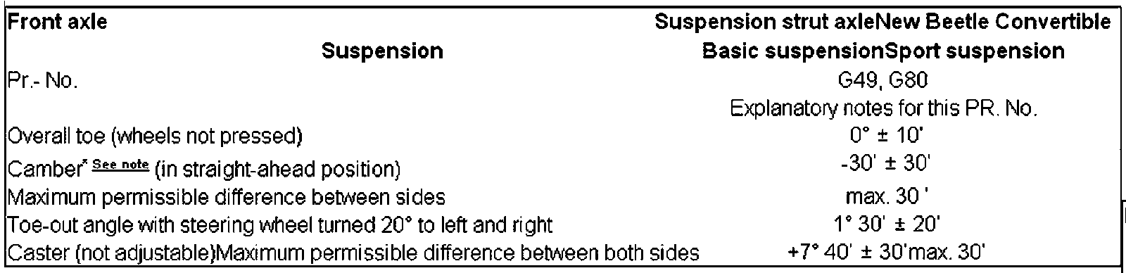 Camber is not adjustable. Only slight corrections are possible by moving the subframe. Adjustment range approx. 10' to 15'