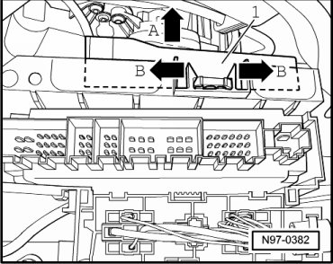 - Push locking hooks of bracket outward - arrows B - and pull Access/Start Authorization Control Module (J518) - 1 - behind bracket forward - arrow A -.