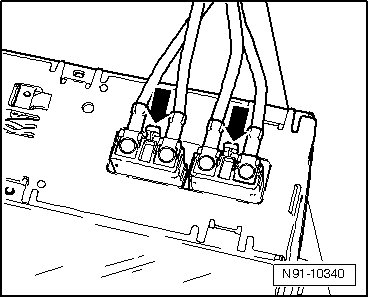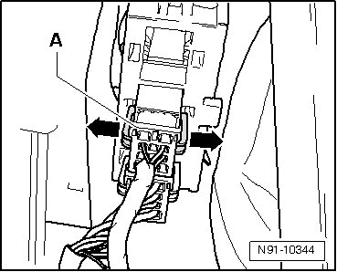 - Disconnect voltage supply connector - A - by pressing both securing tabs on connector in - direction of arrow - and then removing connector.