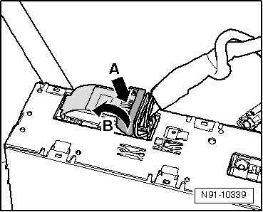 - Release 54-pin connector by pressing on clip - A - and at the same time, tipping catch - B - in - direction of arrow -.