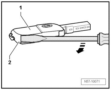 - Insert a screwdriver in the slot between the cover - 1 - and the key - 2 -.