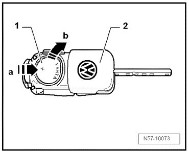 - Slide the battery - 1 - in the direction of - arrow a - and remove it upward - arrow b - from the key - 2 -.