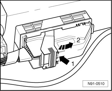 - Press securing clip - 1 - and actuate locking lever in - direction of arrow 2 -, to do so.