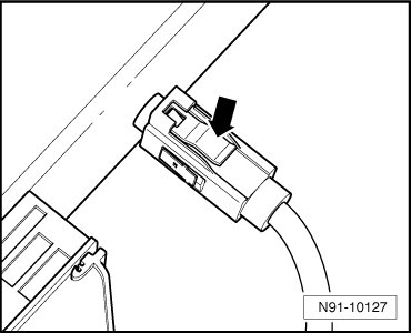 - Disconnect both harness connectors for antenna wires from Telematics control module. Push in locking mechanism - arrow - and disconnect antenna connector.
