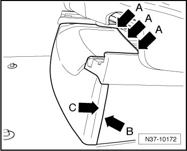 - Release retaining tabs - A, B, and C - and remove the right passenger seat trim.