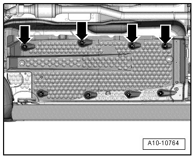 - Remove the tunnel bridge nuts - arrows - and tunnel bridge from the vehicle floor.