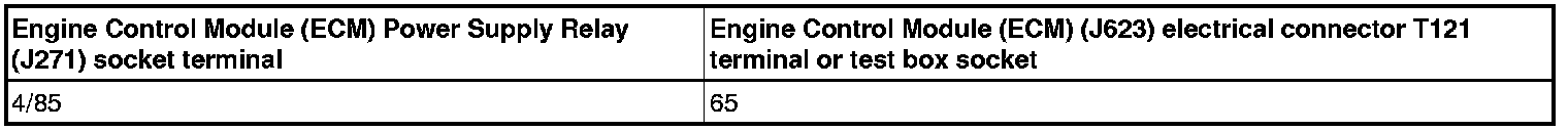 - Using a Multimeter, check the Engine Control Module (ECM) Power Supply Relay (J271) socket 4/85 to the Engine Control Module (ECM) (J623) electrical harness connector T121 terminal 65 for resistance.