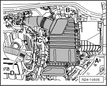 - Remove the air filter housing and connecting hose, while doing this remove the bolt - A -, disconnect the connector - B - and remove the spring clip - C -. When re-installing, observe the mark - D -.