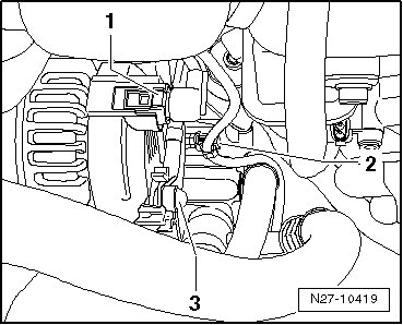 - Remove nut - 1 - (15 Nm) on B+ wire - 2 - from generator and set aside B+ wire.