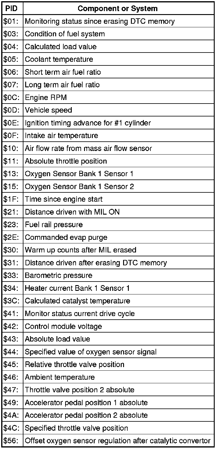 • Depending on scan tool and protocol used, the information in diagnostic mode 01 may be referred to by different names such as Test-ID (TID), Hex-ID, Component-ID (CID), or On-Board Diagnostic Monitor Identifier (OBDMID).
