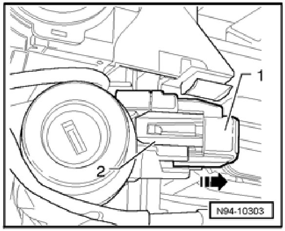 NOTE: To remove ignition key in vehicles with automatic transmission, always shift selector lever into position "P" and then switch off ignition. Otherwise, Ignition Key Removal Lock Solenoid N334 prevents ignition key from being removed