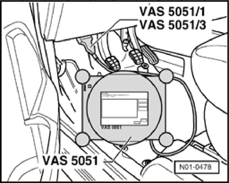 - With ignition switched off, connect Vehicle Diagnostic Testing and Information System VAS 5051 / VAS5052 with adapter cable to Data Link Connector (DLC) located under the instrument panel, left.