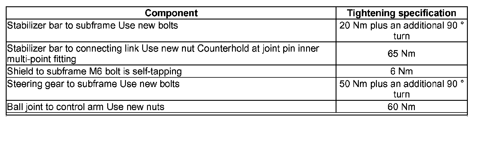 Tightening specifications, subframe to body