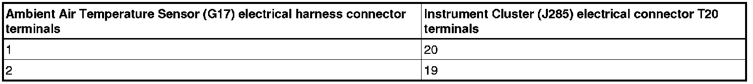 - Using a multimeter, check the Ambient Air Temperature Sensor (G17) electrical harness connector to the Instrument Cluster electrical harness T32 connector for an open circuit or a short, refer to the wiring diagram.