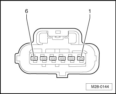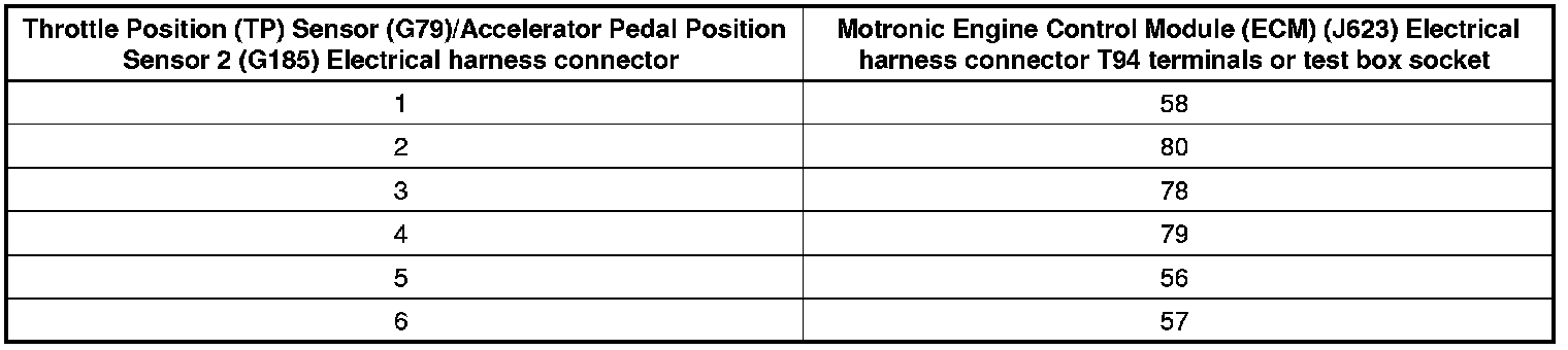 - Using a multimeter, check the Throttle Position (TP) Sensor (G79)/Accelerator Pedal Position Sensor 2 (G185) electrical harness connector terminals to the Motronic Engine Control Module (ECM) (J623) electrical connector T94 for resistance.