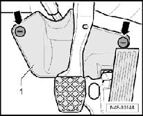- Remove mounting nuts - arrows - and remove foot well trim - 1 -.