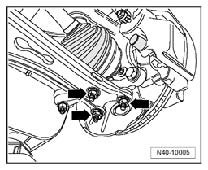 - Loosen bolts - 4 and 5 - and lower subframe with brackets slightly. Observe electrical wires, when doing so.