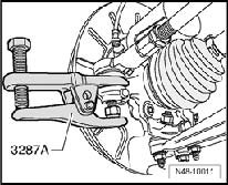 - Press off tie rod end from wheel bearing housing with ball joint puller 3287A and then remove nut.