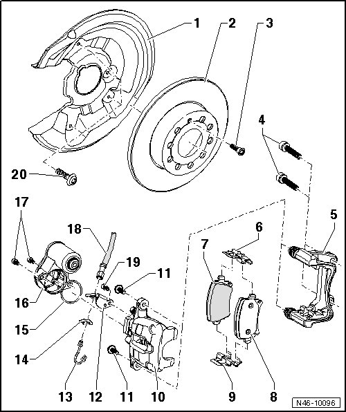 • Before removing brake caliper or disconnecting brake hose, brake pedal depressor (V.A.G 1869/2) must be inserted (this dissipates pressure).
