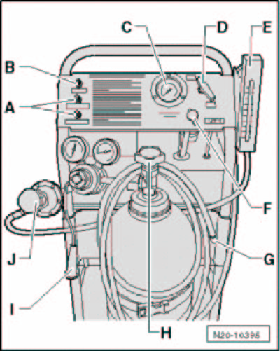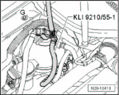 - Connect measuring hose - G - on evaporative emissions tester KLI 9210 to adapter hose KLI 9210/55-1.